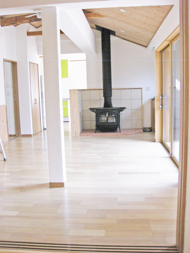 11.リビング リビング奥から玄関方向を見たところ。 玄関を入ると、薪ストーブが。 |