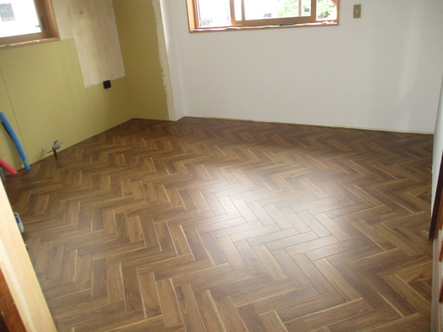 床はヘリンボーンのクッションフロアを貼りました