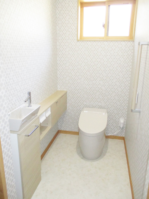 トイレは車いすも入れる広さと手摺も付け、入口は引き戸にして出入りし易くしました。